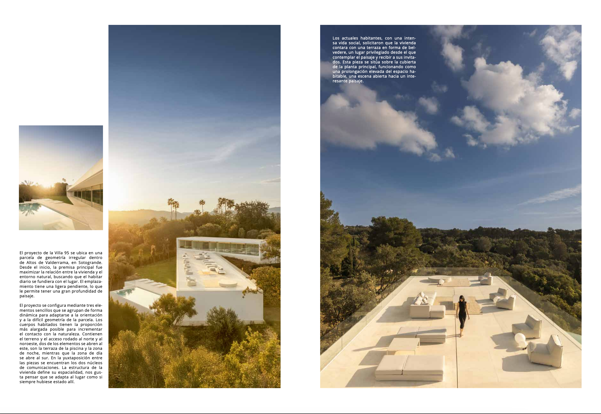 En este número, la revista presenta Villa 95 como una vivienda que se funde con el entorno natural y que ha sido concebida con una clara voluntad de permanencia. Desde su configuración formal —basada en tres volúmenes alargados que se adaptan a la topografía de la parcela— hasta su sistema estructural, el proyecto busca maximizar la relación entre el espacio habitable y el paisaje.