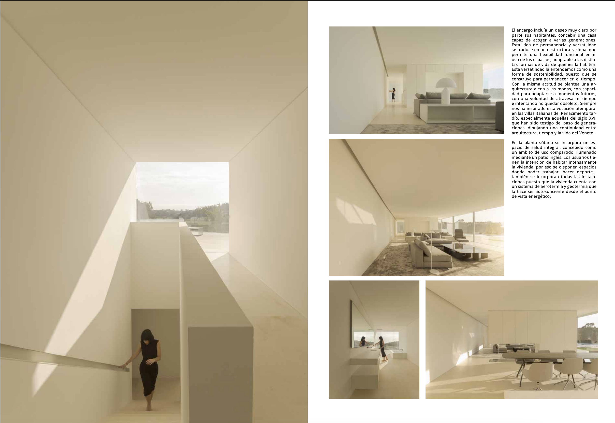 El reportaje destaca aspectos como la terraza belvedere diseñada para recibir invitados y contemplar el entorno, la flexibilidad funcional que permite habitar la casa a lo largo de generaciones, y la incorporación de tecnologías como la aerotermia y la geotermia, que hacen de esta vivienda un ejemplo de arquitectura autosuficiente.