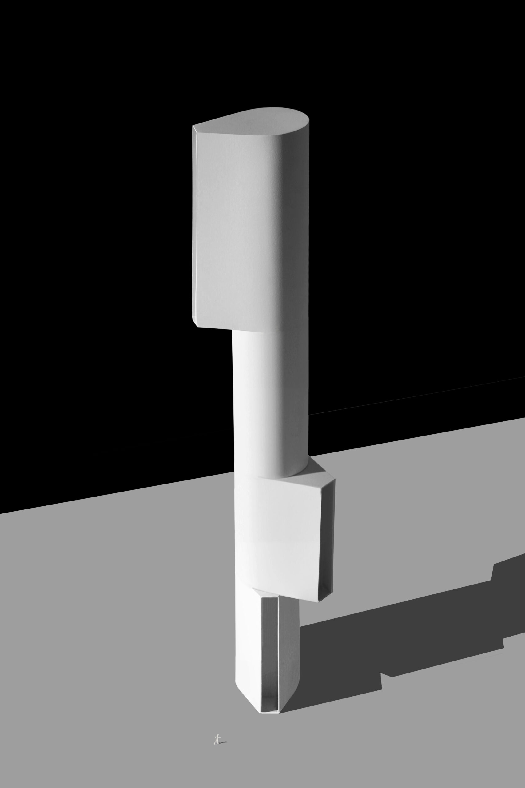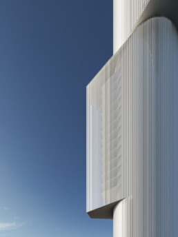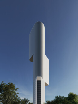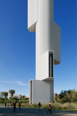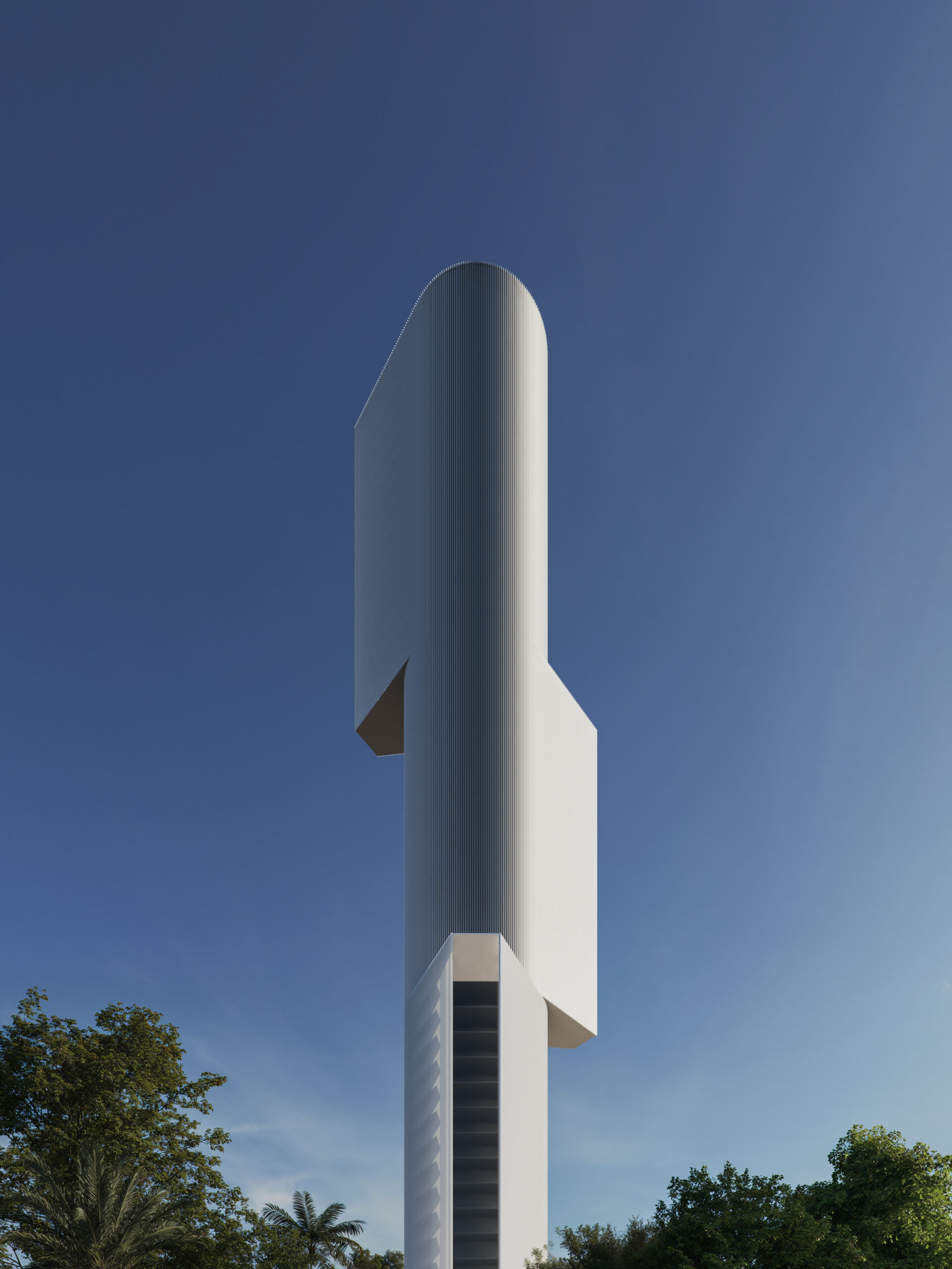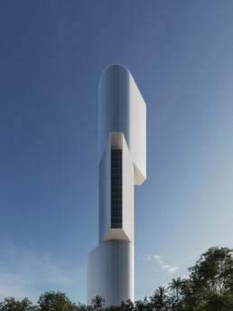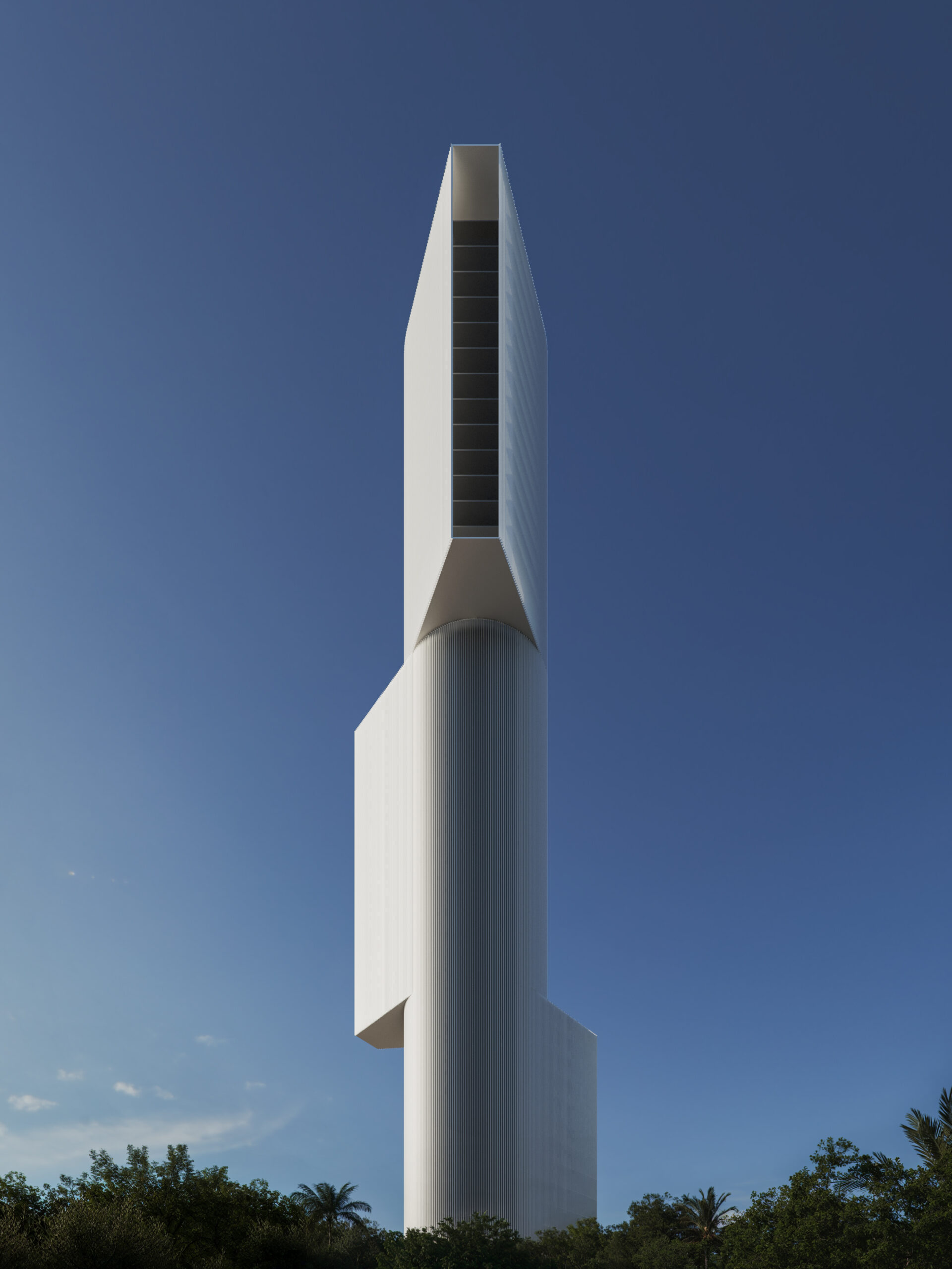 La torre se estructura a partir de cuatro cuerpos de carácter cilíndrico que se completan con una abertura vertical, esbelta y marcada en uno de sus lados. Cada una de estas aberturas se orienta en una dirección distinta, ofreciendo perspectivas y visuales específicas desde el interior. Esta disposición genera una experiencia cambiante, ya que el edificio adquiere una identidad variable según el ángulo desde el que se observa, reforzando su condición dinámica dentro del entorno urbano.