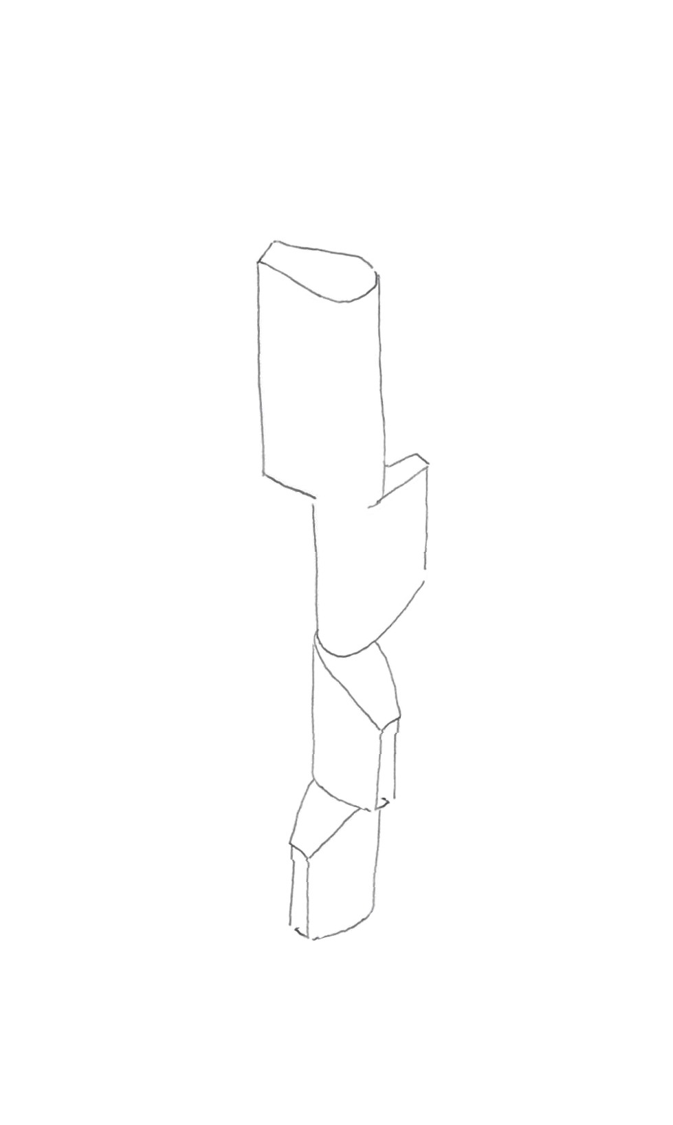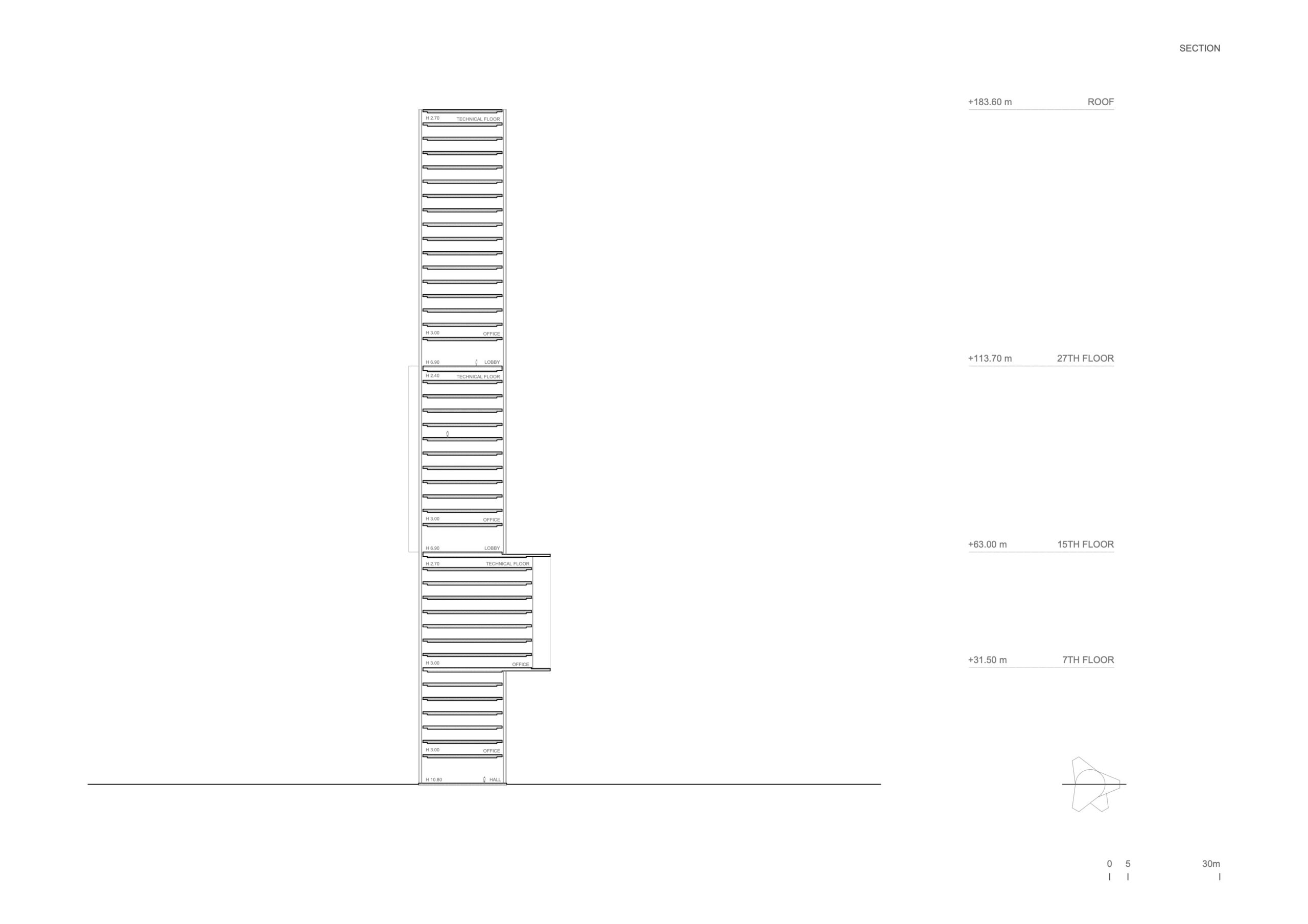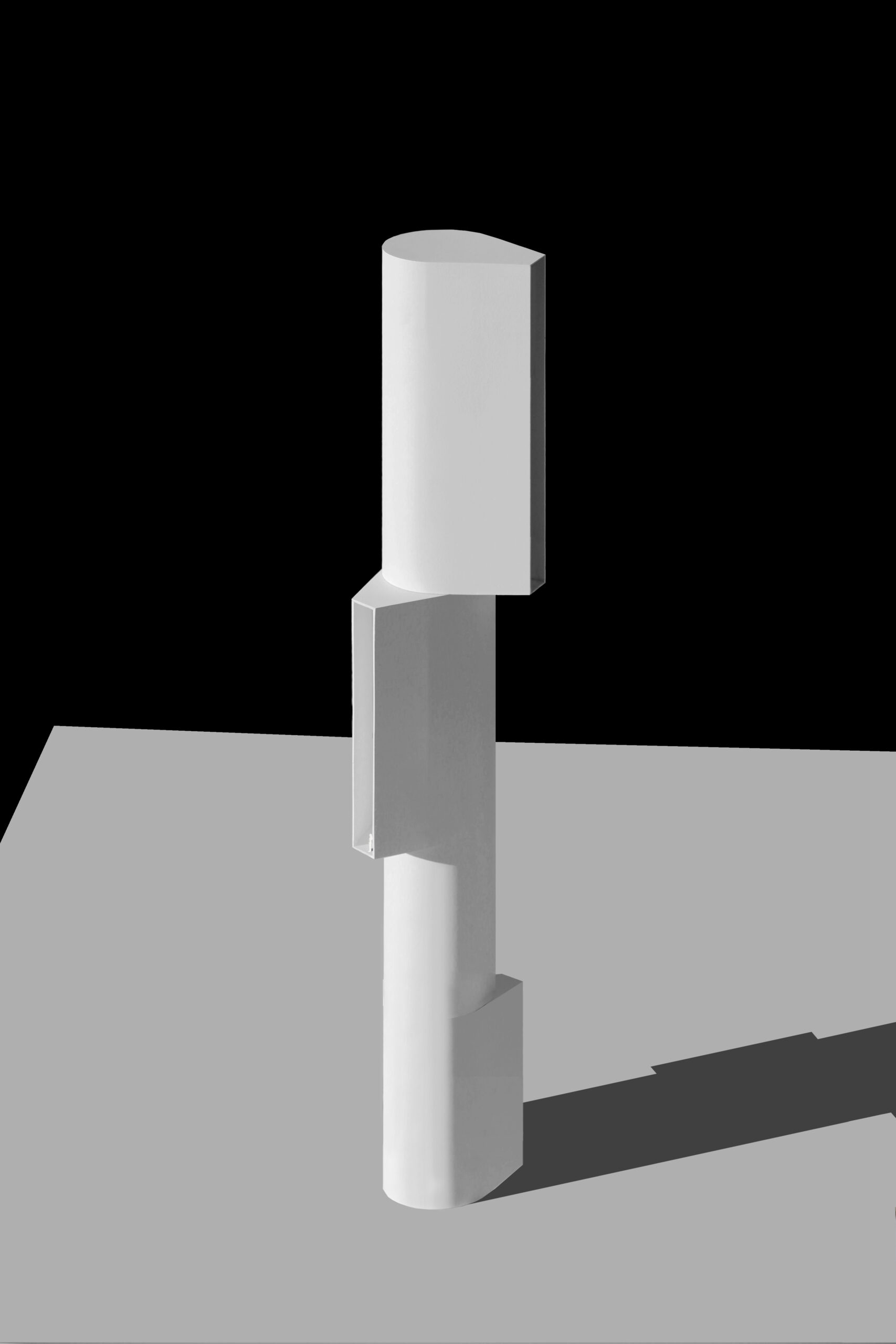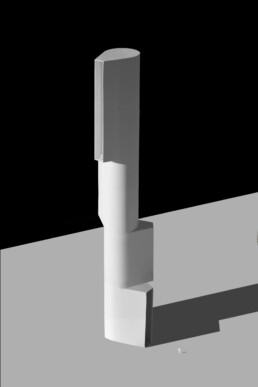 La torre se estructura a partir de cuatro cuerpos de carácter cilíndrico que se completan con una abertura vertical, esbelta y marcada en uno de sus lados. Cada una de estas aberturas se orienta en una dirección distinta, ofreciendo perspectivas y visuales específicas desde el interior. Esta disposición genera una experiencia cambiante, ya que el edificio adquiere una identidad variable según el ángulo desde el que se observa, reforzando su condición dinámica dentro del entorno urbano.