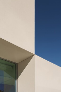 Entre la zona de día y el ámbito deportivo se dispone un espacio pasante, prácticamente orientado norte–sur, que actúa como transición y favorece las ventilaciones cruzadas. Una de las premisas fundamentales consiste en orientar la zona de noche hacia el este, asegurando su vinculación directa con la luz de la mañana.Se persigue, además, una mayor altura libre en el espacio principal. La volumetría se resuelve mediante dos cuerpos de menor altura entre los que se intercala un volumen de mayor dimensión. Este último, correspondiente a la zona de estar, parece elevarse ligeramente, subrayando su presencia y otorgando identidad a la propuesta; su canto ancho refuerza esa condición, de modo que el volumen parece levitar sobre el espacio que protege.El espesor de este cuerpo permite alojar en su interior una estructura de gran canto, de modo que el espacio principal puede salvar toda su luz sin apoyos intermedios. La zona de día se concibe así como un ámbito continuo, en relación directa con el pavimento exterior y la lámina de agua, diluyendo el límite entre interior y exterior y reforzando el carácter abierto de la vivienda. En el interior, los materiales se resuelven mediante un cromatismo continuo y cálido. Algunos paramentos verticales y piezas de mobiliario se ejecutan en madera de roble, aportando textura y profundidad al conjunto. Esta decisión, junto con la temperatura de color de la iluminación, confiere a la propuesta el carácter doméstico buscado.