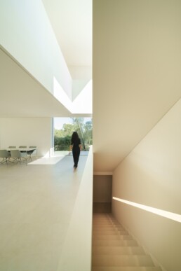 The first is to enhance the views from each level of the house: the ground floor, which contains the daytime areas, is oriented towards the garden, while the upper floor, where the nighttime areas are located, opens up to a nearby lake, visible only from that height. The second reason is to provide shaded outdoor spaces, essential for protection from Madrid’s intense sun. The rotation between the volumes generates covered terraces. The third reason, perhaps more subjective but equally relevant, is to give the house its identity. The inclination between the volumes creates shifting triangular shadows throughout the day, adding dynamism.