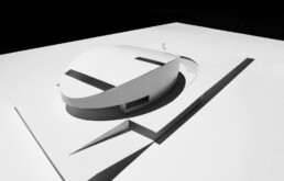 Four concrete supports on the lower floor hold the arched roof, from which the room’s floor hangs. This structure is covered by a monolithic, ventilated façade, which is realized with a Solid Surface with a simple curve that doesn’t require thermoforming to adapt to the geometry of the piece. The rest of materials used in the construction range from white to black, covering all scales of grey.