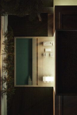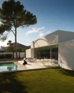 La arquitectura se sitúa en la franja oeste de la parcela. Este desplazamiento permite ampliar el espacio exterior vinculado a la zona de estar, intensificando su relación con el jardín y la piscina. Al mismo tiempo, la implantación respeta las especies de gran porte existentes, que se complementan con nuevas plantaciones llamadas a consolidar, con el tiempo, un jardín de mayor densidad. El acceso principal se produce desde el lado este, a través de una calle de carácter más tranquilo, reforzando así la privacidad de la vivienda.