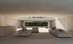 En el otro sentido, y esta vez únicamente abiertos al perímetro, se ubican las dos estancias principales de noche de la casa. En las cuatro esquinas, entre unos espacios abiertos y otros, se ubican cuatro núcleos cerrados que condensan los espacios servidores. La cubierta de la casa se convierte en el último de los espacios que configuran todo el conjunto. A ella se accede a través de una escalera interior y se conceptualiza como una suerte de oasis definido por la presencia de varios límites. En su lado más externo, la propia vegetación del jardín que otorga privacidad a este espacio. En su lado interno, una lámina de agua que corona el patio circular y que presenta una zona más profunda en uno de sus laterales para posibilitar el baño.