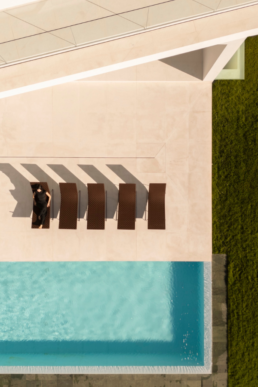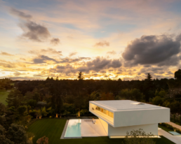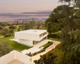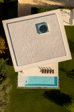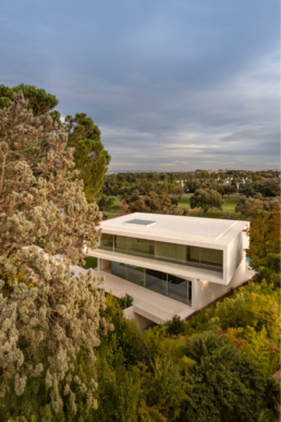 The first is to enhance the views from each level of the house: the ground floor, which contains the daytime areas, is oriented towards the garden, while the upper floor, where the nighttime areas are located, opens up to a nearby lake, visible only from that height. The second reason is to provide shaded outdoor spaces, essential for protection from Madrid’s intense sun. The rotation between the volumes generates covered terraces. The third reason, perhaps more subjective but equally relevant, is to give the house its identity. The inclination between the volumes creates shifting triangular shadows throughout the day, adding dynamism.