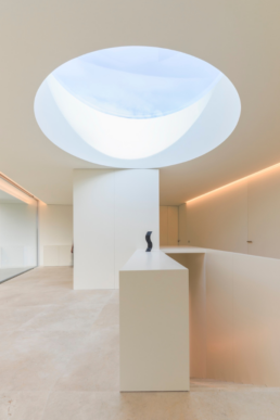 The rotation of the volumes is also expressed in the circular skylight on the upper floor, executed from a single piece. In the basement, the garage and spaces dedicated to wellness and health are located, naturally illuminated through a skylight, as required by the area’s urban planning regulations.