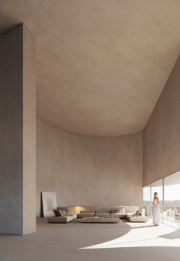 The spatial organisation emerges from a sequence of circular rooms that gradually reveal themselves as one moves through the house. This measured progression creates an interior rhythm in which each space acquires its own identity without losing continuity with the whole.