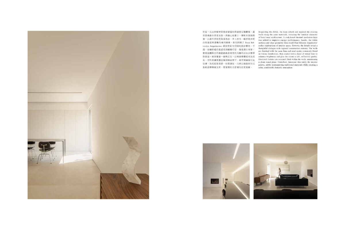 The article presents Mas Cadalt as a careful rehabilitation of an old farmhouse in ruins, set within the mountainous landscape of Serrat de la Cadalt in Girona, transformed into a contemporary home without losing its original identity. The feature analyses how the project preserves the rural volumetry and typology, reconstructs the stone walls using traditional techniques, and contrasts the vernacular exterior with a white, luminous interior of precise geometry. By harnessing natural light and reinterpreting local materials such as lime, stone and cork, the project achieves a self-sufficient dwelling that is integrated into the landscape and balanced between memory and contemporary living.