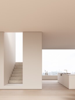 At the same time, this approach enhances the spectacular surrounding views, multiplying their presence within the interior. The main living area is organized around a single piece of furniture, whose circular geometry contrasts with the square plan of the space. This piece integrates the sleeping area with the bed, study and reading zones, as well as a bathtub within its structure. A play of ascending geometries conceals the steps leading to the upper floor of the apartment, subtly resolving the division between the day and night areas of the home.